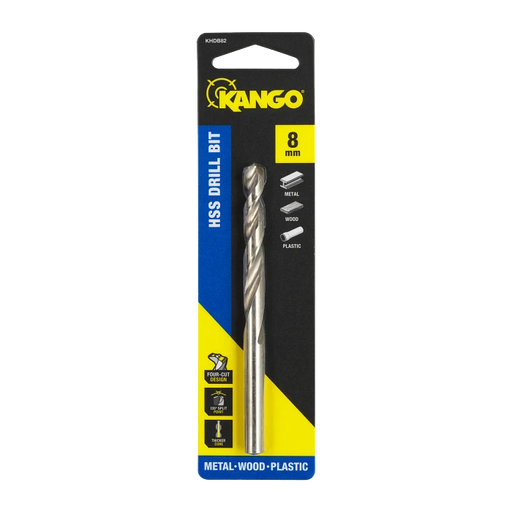 Island Enterprises LimitedFeatures Four-cut design 135 split point Thicker core Rapid eject flute Chamfered edges Usage Metal Wood Plastic The Kango 8mm HSS Drill Bit i...