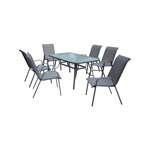 Island Enterprises LimitedThe Marquee steel sling back seven piece setting features six black and grey sling back chairs with a tempered glass table with steel frame. Provid...