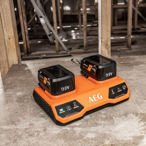 The AEG 18V Dual Port Simultaneous Rapid Charger charges two 18V batteries at once with a fast 4A charge rate, offering LED status indicators, coo...