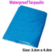 The medium-sized 3.6 x 4.8m blue tarpaulin is a durable, UV-resistant, waterproof polyethylene tarp suitable for outdoor protection, camping, construction, or vehicle covers.